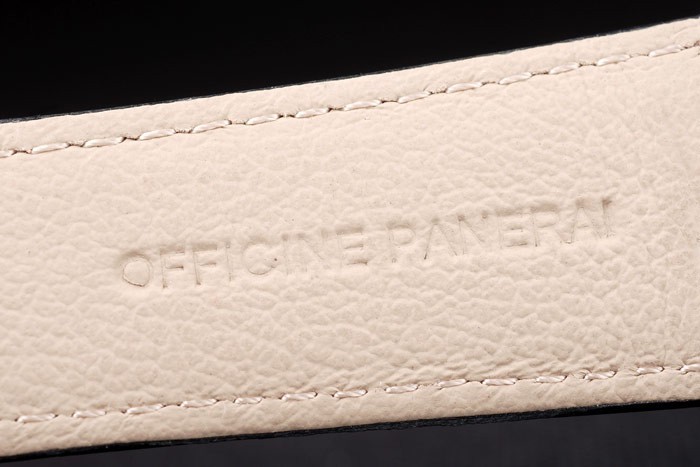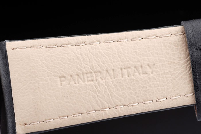 Armband: Schwarzes Lederarmband mit weißen Nähten und Wärme geprägt Officine Panerai Italien Stempel und gebürstetem Edelstahl Haken-Schließe mit Panerai engraving