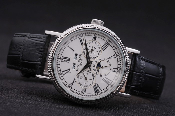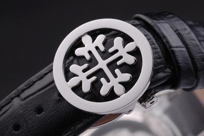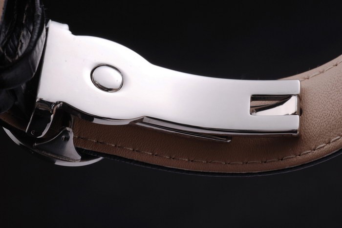 Armband: Schwarzes Lederband mit Patek Philippe Stempel und einem Edelstahl-Falte in clasp